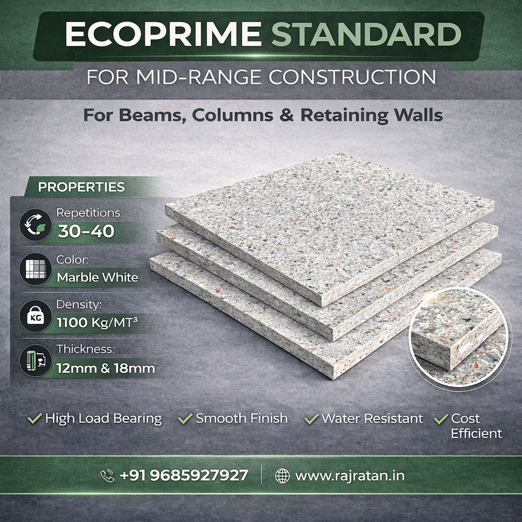 PAC® Shuttering Boards are made from a high tensile composition of industrial plastics (PP, LDPE, HDPE), alumina oxide, reinforcing fibers, and XLP metals. This robust construction ensures extreme strength, longevity against harsh weather and repeated concrete pours, and makes them 100% termite and fungus proof, ideal for challenging sites. Manufactured under high pressure, these high-density boards maximize load-bearing ability and lifespan. Rajratan PAC® Boards are UV stabilized and damage-proof (break/crack). These strong, reusable hybrid boards maintain performance over multiple uses. A key benefit is Rajratan’s Replacement Policy, allowing replacement of old/damaged boards even 5–7 years post-warranty, making them an economical, reliable long-term solution.